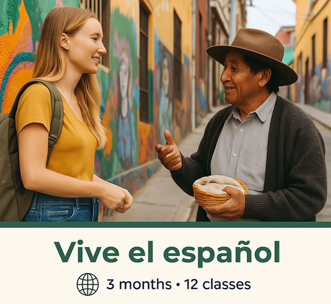 Este paquete está diseñado para quienes quieren ir más allá de lo básico y empezar a expresarse con mayor soltura. Durante dos meses, con una clase semanal, trabajarás vocabulario útil, expresiones cotidianas y estructuras que te permitirán comunicarte con más confianza. También tendrás la oportunidad de explorar aspectos culturales de uno o varios países latinoamericanos según tu interés.